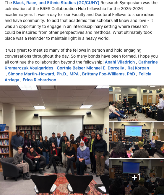 alt text: The Black, Race, and Ethnic Studies (GC/CUNY) Research Symposium was the culmination of the BRES Collaboration Hub fellowship for the 2025-2026 academic year. It was a day for our Faculty and Doctoral Fellows to share ideas and have community. To add that academic flair scholars all know and love - It was an opportunity to engage in an interdisciplinary setting where research could be inspired from other perspectives and methods. What ultimately took place was a reminder to maintain light in a heavy world.